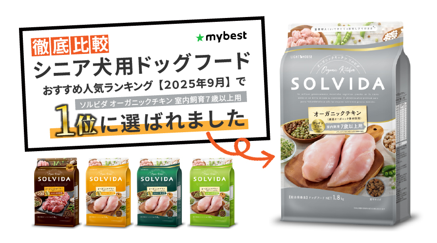 ソルビダが商品比較サイト「マイベスト」のシニア犬用ドッグフードおすすめ人気ランキングで1位に選ばれました!
