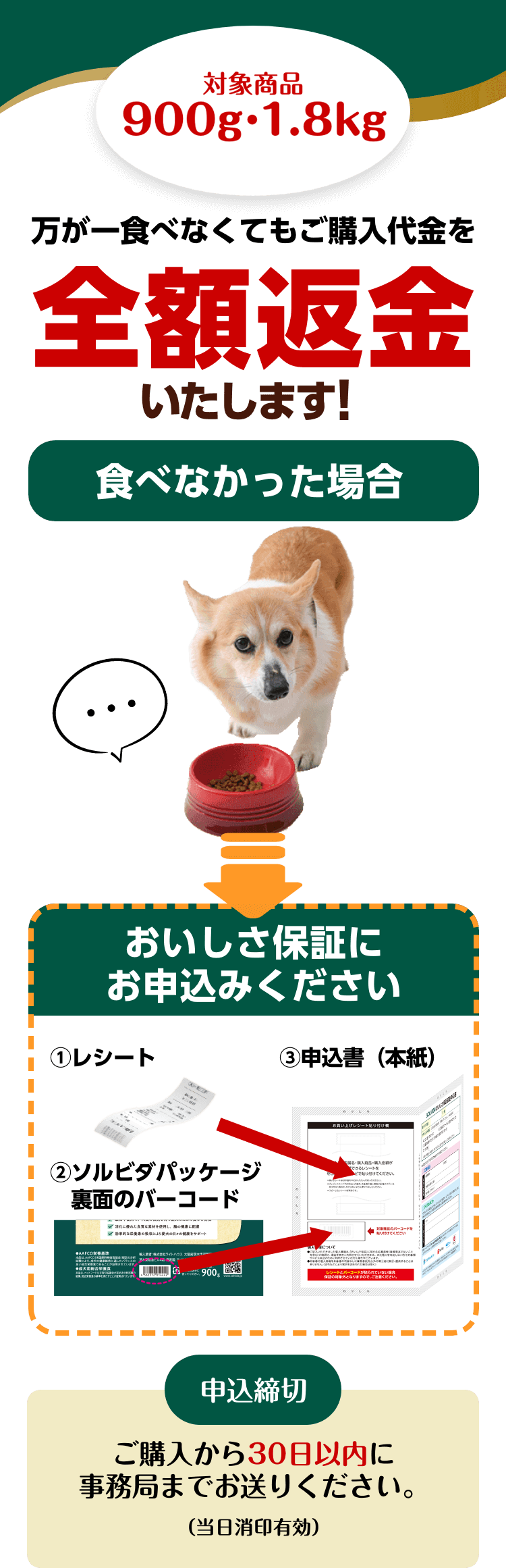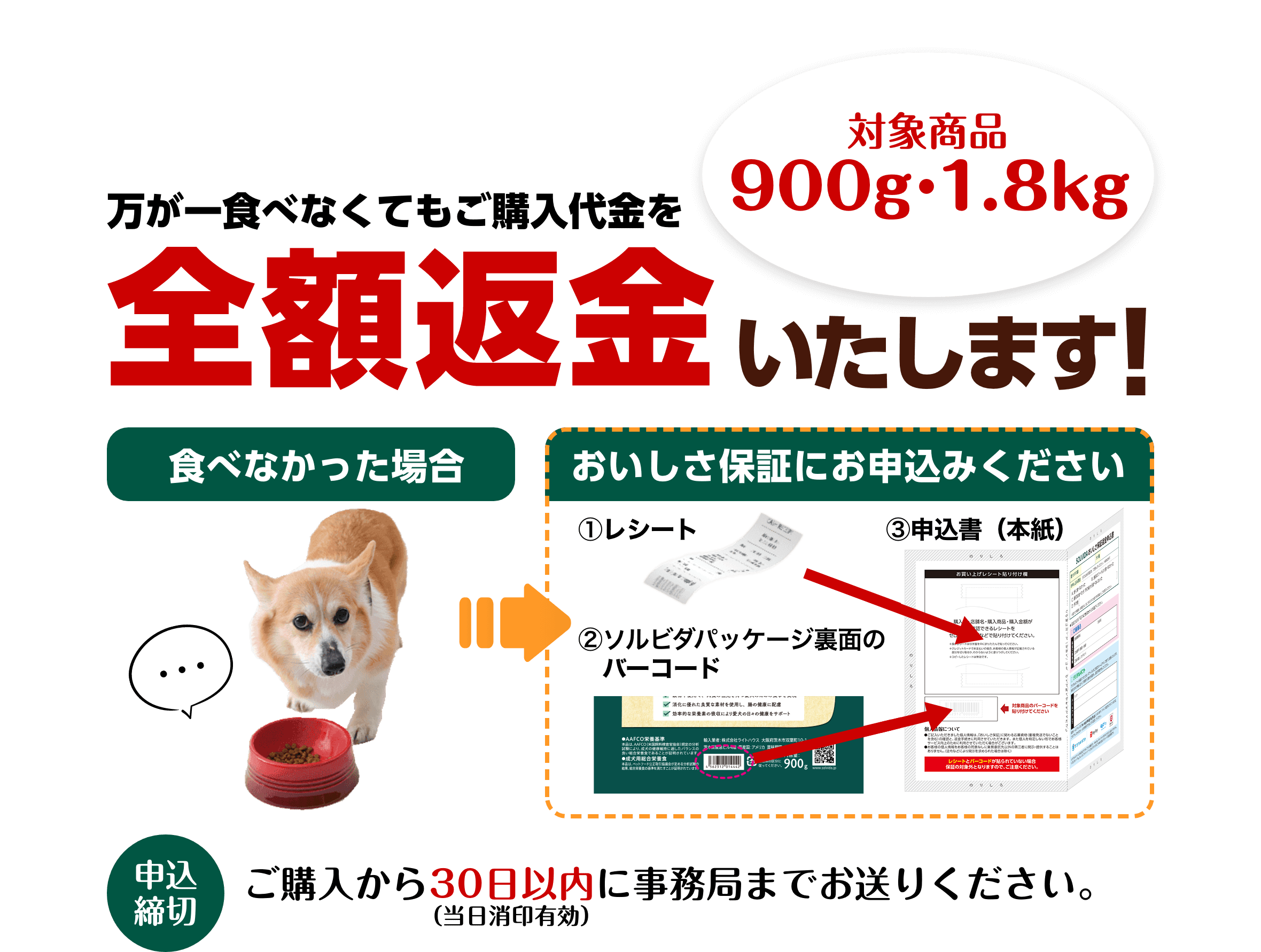 - ご返金は、返金申込書が到着し、弊社にて「ソルビダおいしさ保証」(以下、「おいしさ保証」と記載)の対象である旨を確認後、1ヶ月程度で弊社よりお申込者様ご指定の方法にてご返金させていただきます。